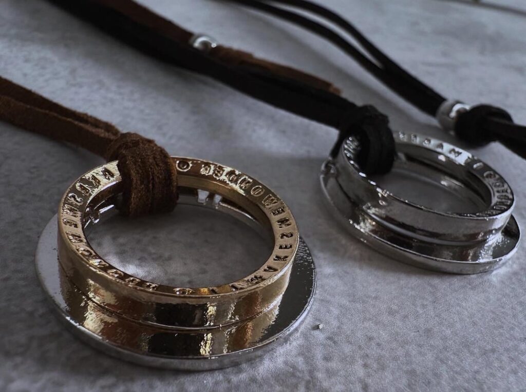 素材:紐 合皮、トップ 朱錫鋳造
